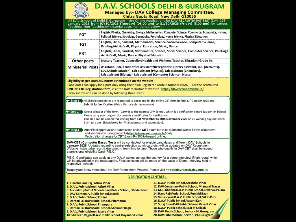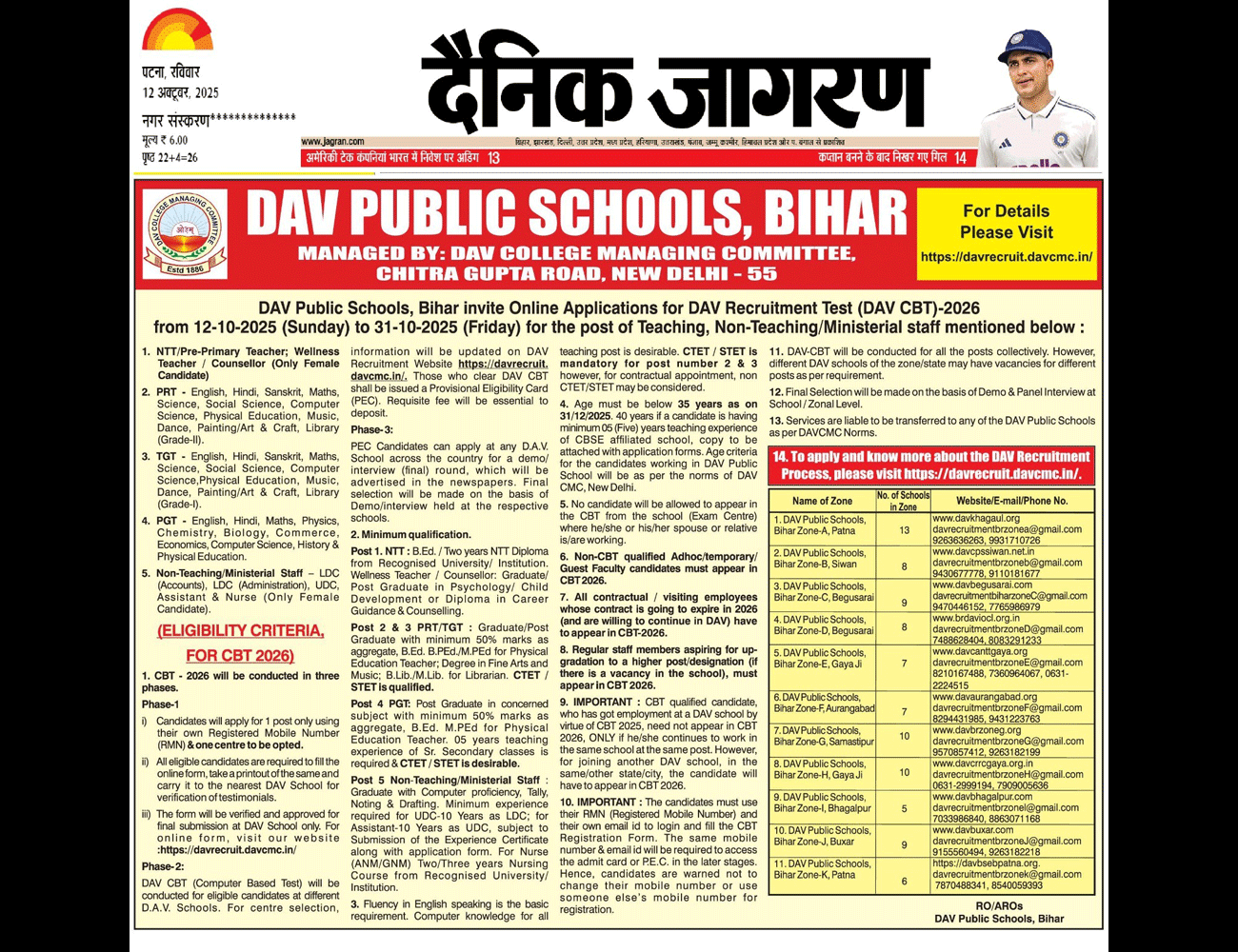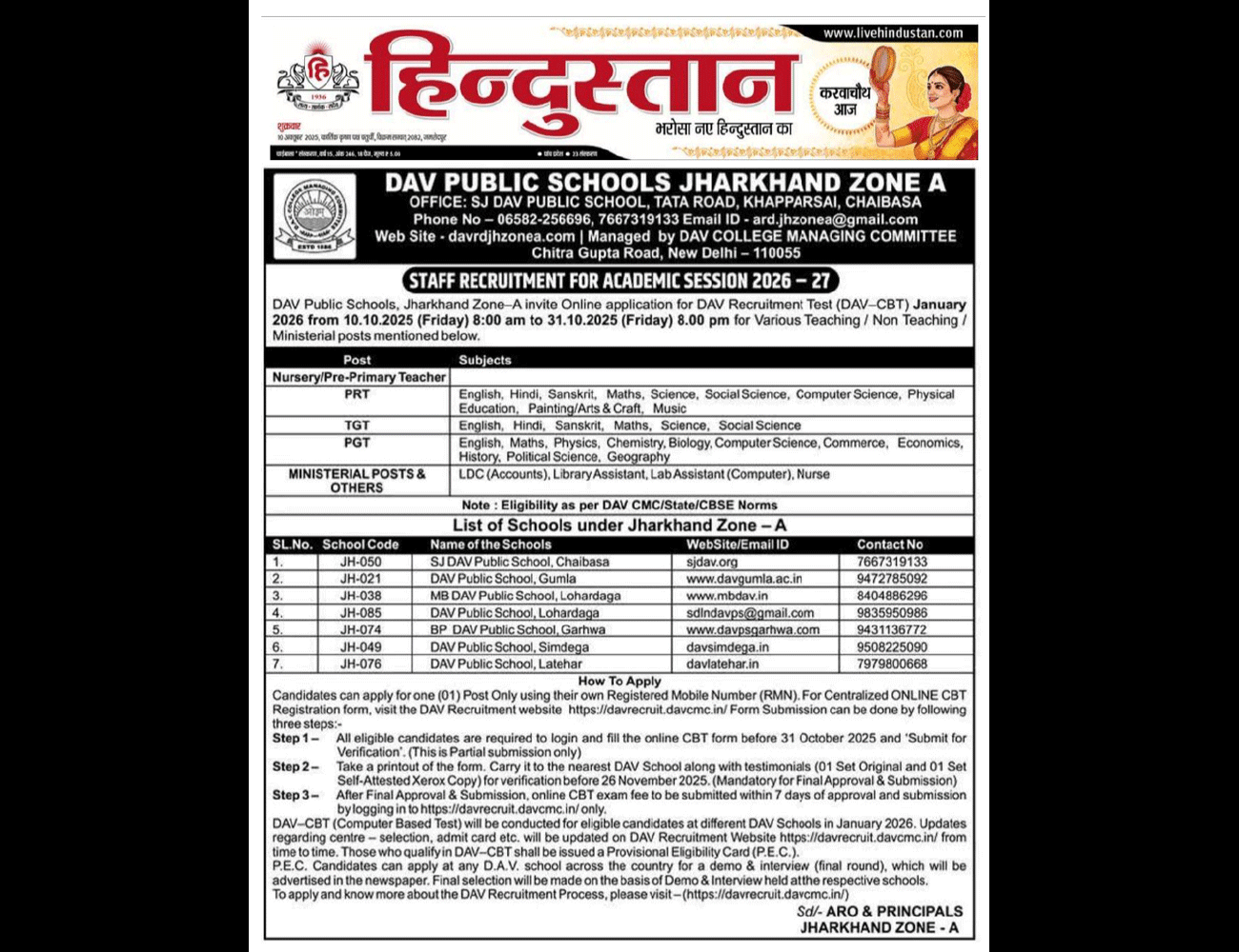 DAV Schools Recruitment 2026 For PGT, TGT, PRT, Non-Teaching Posts |Check Eligibility, Qualification, and CBT Exam Details